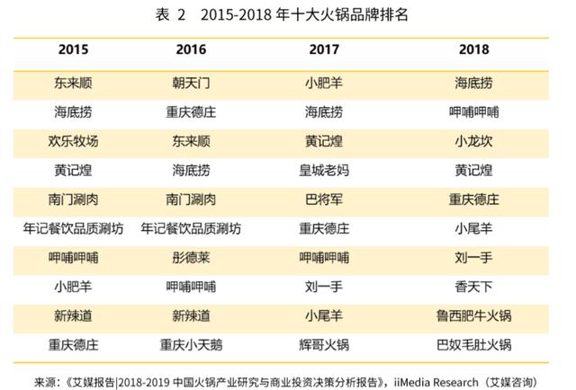 iiMedia Research(艾媒咨詢)數(shù)據(jù)顯示,在2015-2018年十大品牌統(tǒng)計中,榜首易主頻繁。但海底撈、呷哺呷哺兩家火鍋店始終在榜,并在2018年分別位居第一、第二。